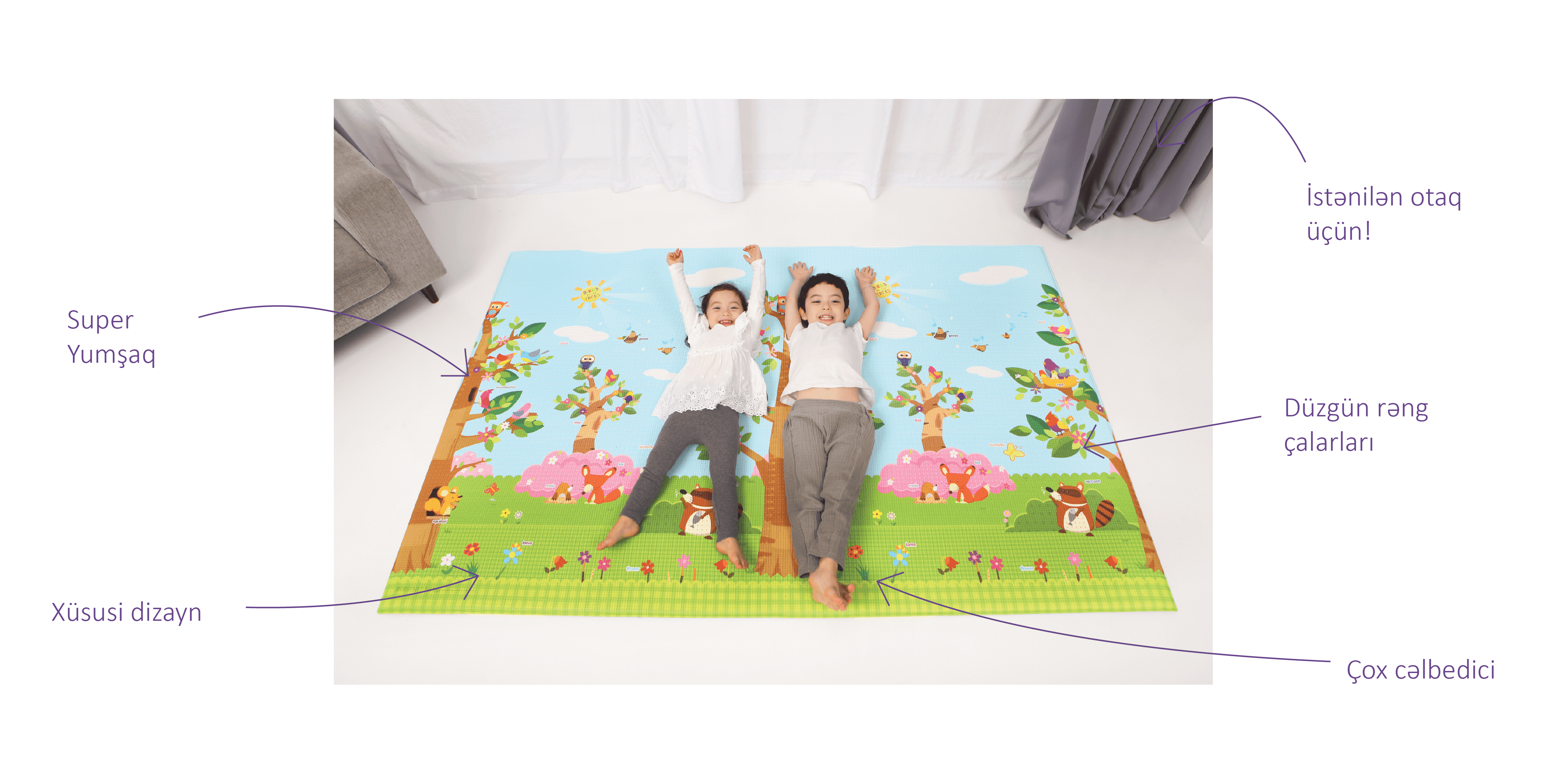 Babycare Crown Birds in the Trees körpələriniz üçün sağlam və gigiyenik bir mühitin təminatçısıdır. ikitərəfli dizayna malikdir. Ön hissəsinin mövzusu ağaca qonan quşlardır. Arxa hissəsinin dizaynında hərflər və heyvam rəsmlərindən istifadə edilmişdir. Bu elementlər isə digər məhsullarda olduğu kimi rəngarəng kvadratların içərisində verilmişdir. Həmin kvadratların içərisində latın əlifbasının hərfləri və heyvan rəsmləri təsvir edilmişdir. Bu öyrədici elementlər isə zehni inkişafı təmin edəcəkdir. Playmat həm qonaq otağında, həm uşaq otağında rahat istifadə edilə bilər.