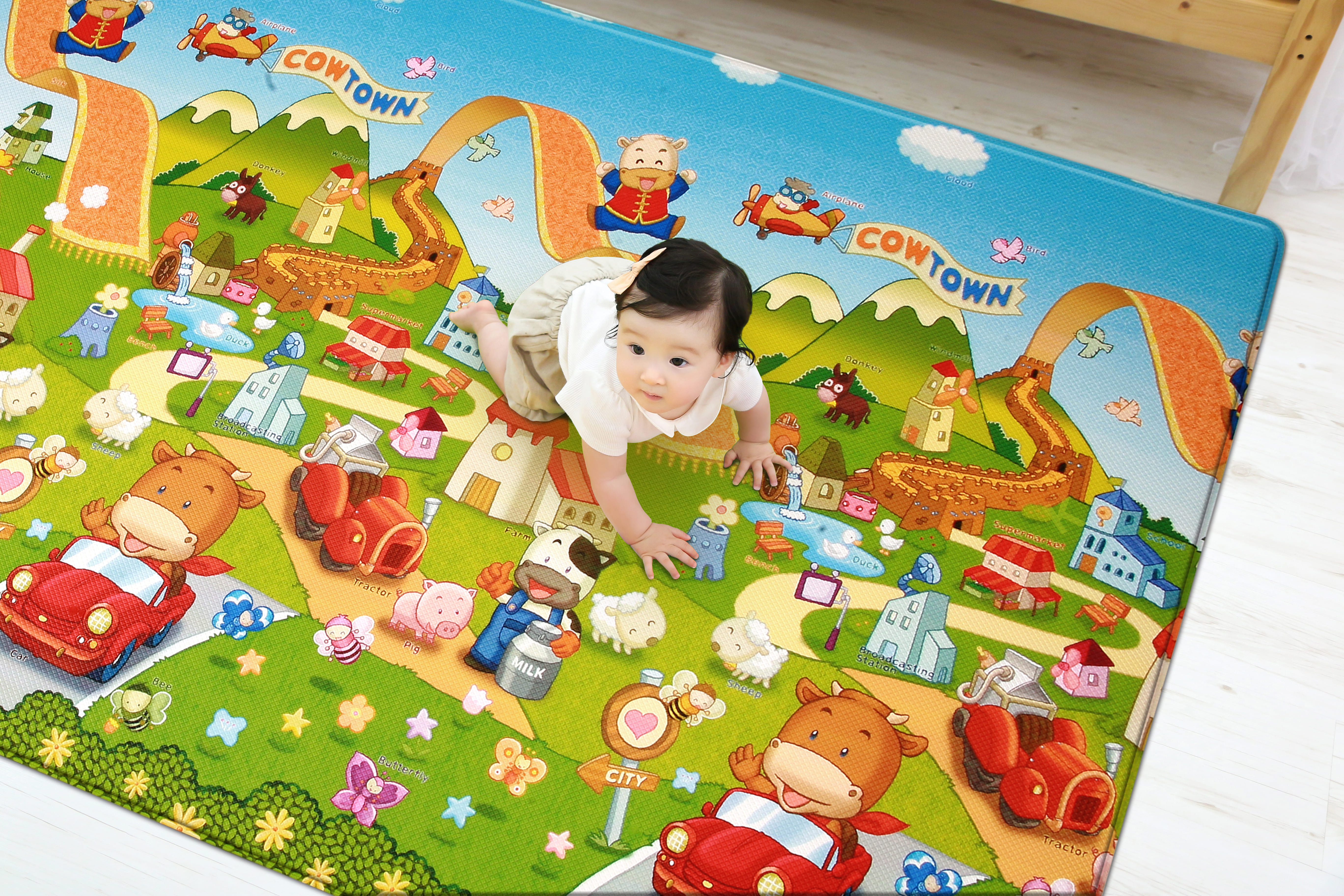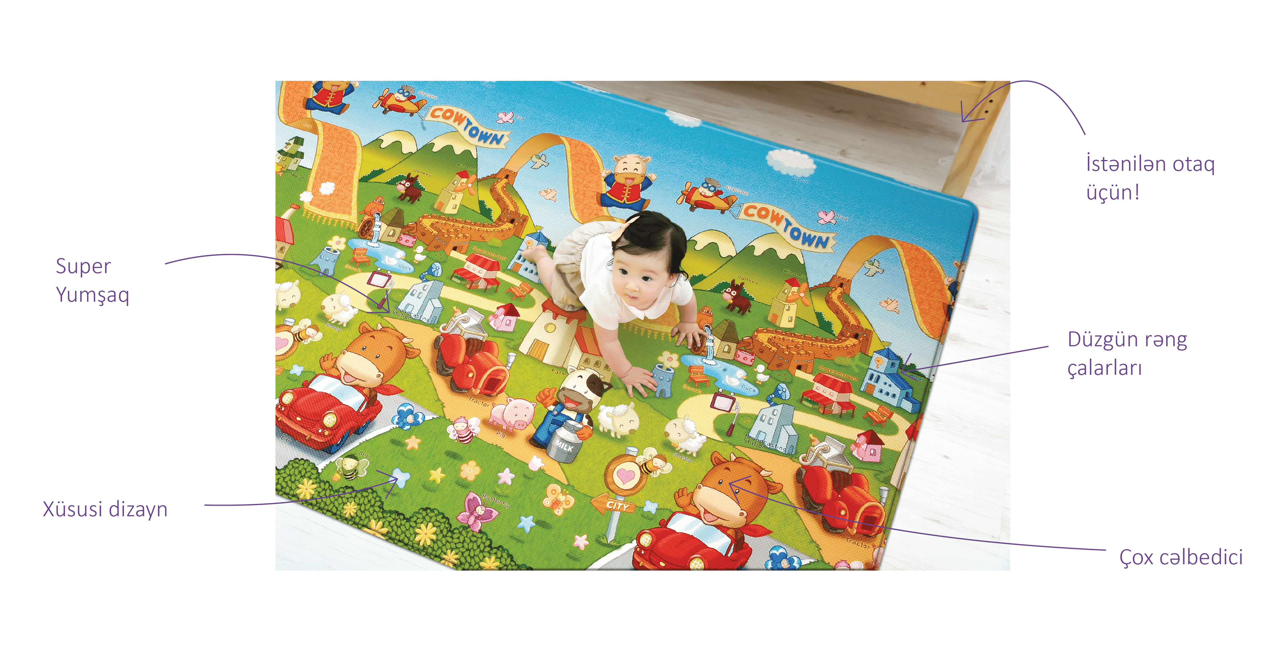 Dwinguler Cow Town ikitərəfli yumşaq xüsusi unikal playmatdır. Bu oyun xalısının ön hissəsində müxtəlif heyvan şəkilləri təsvir edilmişdir. Arxa üzdə isə heyvan təsvirləri və onların adları qeyd edilmmişdir. Bu playmat hesabına övladlarınız heyvanları tanıya biləcək və fərqləndirəcəkdirlər. Coow Town playmatı həyata yeni başlayan körpələrin dünyanı kəşf edə bilmələri üçün unikal vasitədir. Bu yumşaq döşəmə örtüyü övladlarınızın zehni inkişafı üçün nəzərdə tutulmuşdur.