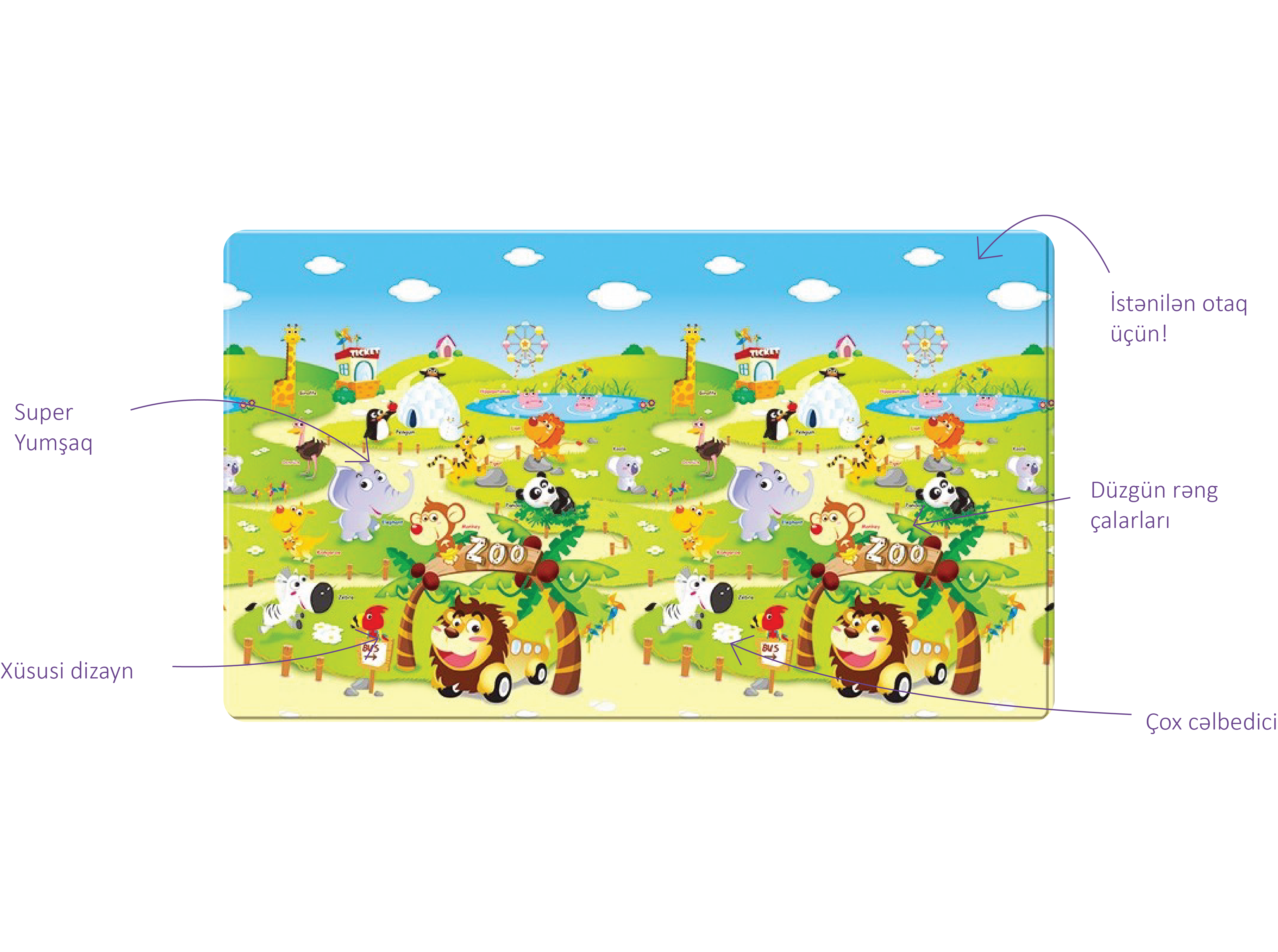 Zoo (Garden) öz seriyasında unikallığı ilə seçilən bir məhsuldur. Bu unikallıq onun dizaynında öz əksini tapmışdır. Zoo (Garden) playmatları körpələrin fantaziyasının inkişafından ötrü çox önəmlidir. Çünki, üzərindəki təsvirlər və həmin təsvirə aid bütün elementlər birbaşa məntiqi mühakimənigücləndirir. Playmatın üzərindəki təsvirlər bunun üçün nəzərdə tutulub. Zehni və fiziki inkişafa yardımçı olacaq bu playmatlar həm də valideynlərin körpələrindən narahat olmaması üçün əvəzsiz təminatçıdır. İdeal oyun təcrübəsini və iki tərəfli istifadə imkanları oyunları əyləncəli hala gətirəcəkdir. Bu playmat həm də soyuqdan və istidən ideal qoruyucudur.